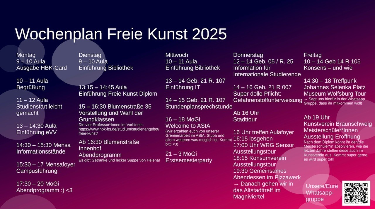 Wichtig: Für den Studiengang Freie Kunst Diplom sind die "Vorstellung der Grundklassenlehrenden" am Dienstag, den 14.10.2025 um 15:00 Uhr und die “Gefahrenstoffunterweisung” am 16.10.2025 10:00 Uhr oder 14:00 Uhr Pflichtveranstaltungen!