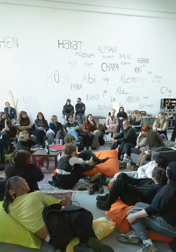 Die Annäherung über den Gedanken des Dîwan, ein Konzept, das bereits zu den OPEN STUDIOS 2026 praktiziert wurde, sprang in sichtbaren Lettern von den Atelierwänden in die Menge der lebendigen Veranstaltung über.