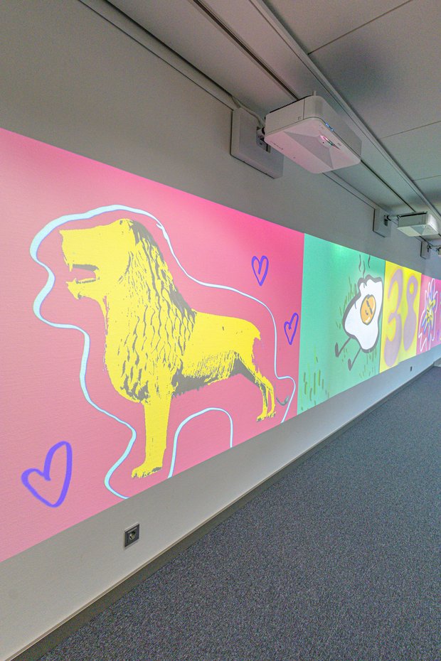 Damit sind die Werke von Studierenden und Absolvent*innen der HBK Braunschweig zusätzlich zu dem Turm des Business Centers im BraWoPark auch im Innenraum der Geschäftsfiliale präsent. Hier kommen die künstlerischen Werke auf der rechten Foyerseite auf voller Länge zur Geltung.