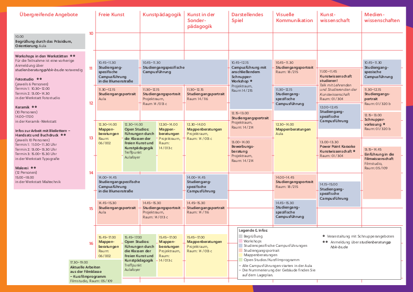 Im Mittelpunkt stehen die grundständigen Studiengänge, also jene, die Schülerinnen und Schülern als Diplom- oder Bachelor-Studiengang direkt nach der Schule offenstehen. Schüler*innen, ebenso wie Eltern und Lehrer*innen haben hier die Möglichkeit, sich mit allen wichtigen Informationen rund ums Studium an Braunschweigs Kunsthochschule zu versorgen.