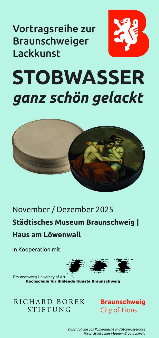 Die Vortragsreihe „STOBWASSER – ganz schön gelackt“ startet am 13. November 2025 und findet wöchentlich an vier Donnerstagen im Städtischen Museum Braunschweig statt. In den Vorträgen werden Aspekte der Produktion Stobwassers mit der Gegenwart verknüpft und aus kuratorischer, ökonomischer, historischer und kunstwissenschaftlicher Perspektive beleuchtet.