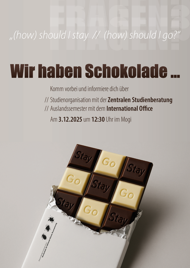 Unter dem Titel “Wir haben Schokolade… – (how) should I stay // (how) should I go?” laden die Zentrale Studienberatung und das International Office zu einer Infoveranstaltung über Studienorganisation und Studieren im Ausland am 3. Dezember ab 12.30 Uhr ins MOGI ein.