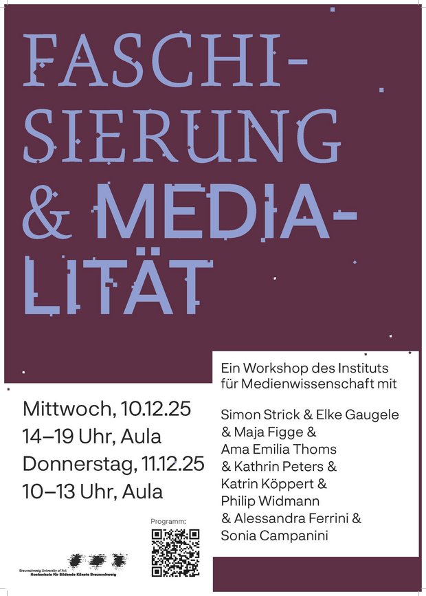 Am 10. und 11. Dezember findet ein 2-tägiger Workshop zum Thema Faschisierung und Medialität in der Aula der HBK Braunschweig statt. Das Institut für Medienwissenschaften lädt alle Interessierten der Hochschule dazu ein.