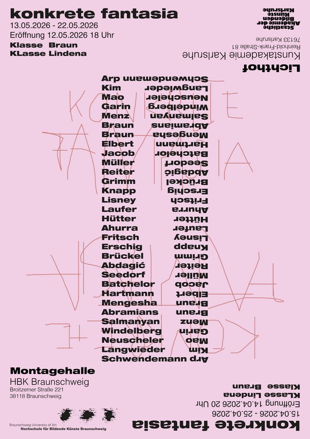 In der Ausstellung „konkrete fantasia“ werden Arbeiten aus der Klasse von Prof. Kalin Lindena von der Staatlichen Akademie der Bildenden Künste Karlsruhe sowie aus der Klasse von Prof. Lutz Braun von der Hochschule für Bildende Künste Braunschweig präsentiert. Die Ausstellung wird vom 15. – 22. April 2026 in Karlsruhe und vom 13. – 22. Mai 2026 in Braunschweig zu sehen sein.