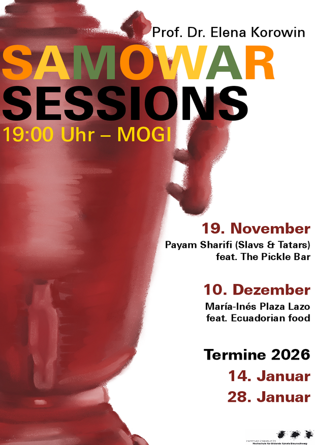 Samowar Sessions sind eine monatliche Veranstaltungsreihe, die als Treffpunkt zum Austausch mit Künstler*innen und Kulturschaffenden gedacht sind. Bei Tee, Essen und Gesprächen sollen in entspannter Atmosphäre neue Verbindungen geschaffen und über Dinge gesprochen werden, die bewegen.