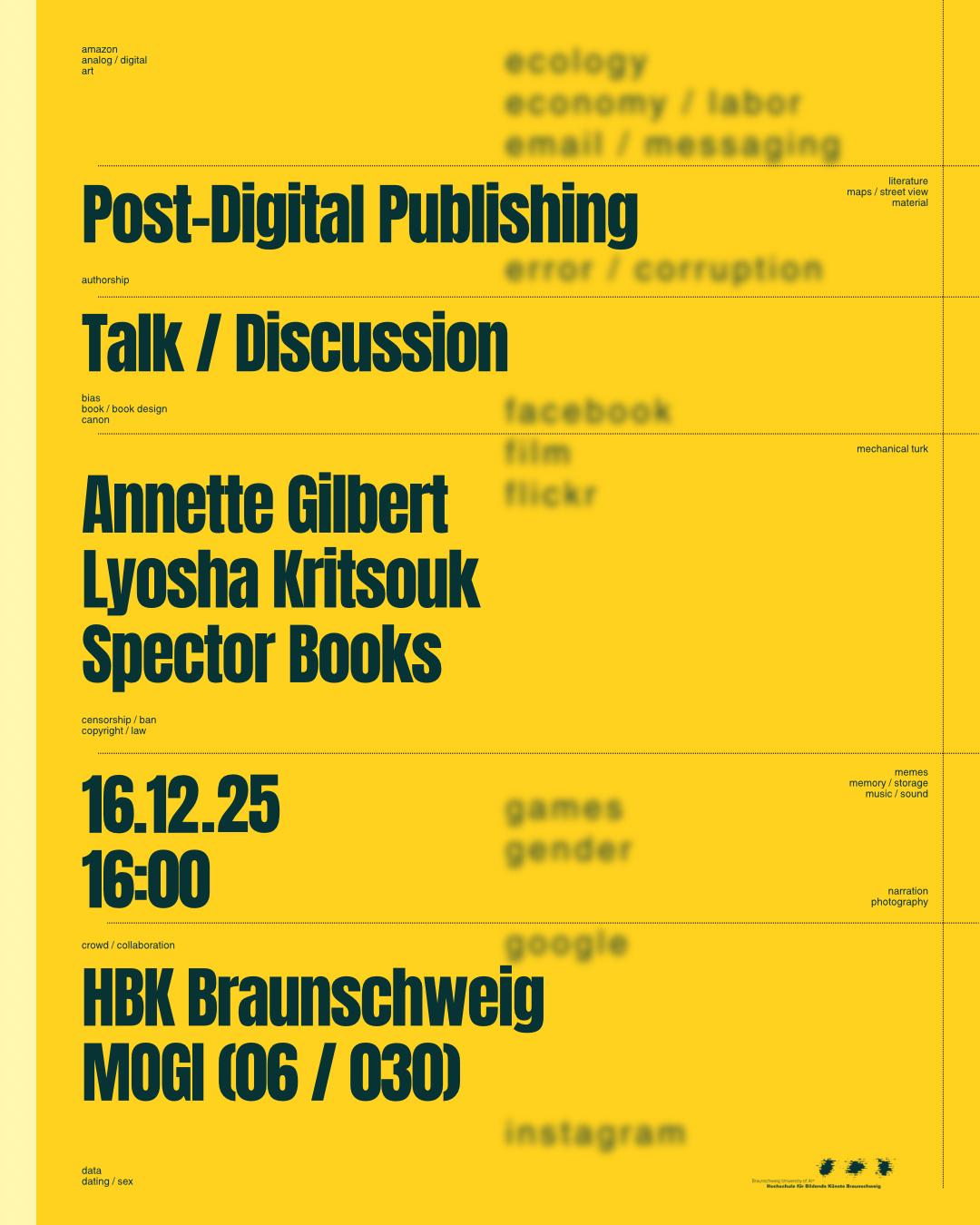Im Mittelpunkt steht das Buch Library of Artistic Print on Demand (Spector Books), herausgegeben von Annette Gilbert und Andreas Bülhoff und das Onlinearchiv www.apod.li. Eine anschließende Diskussion mit dem Designer Lyosha Kritsouk und Spector Books sowie ein Büchertisch laden dazu ein, postdigitales Publizieren aus unterschiedlichen Perspektiven zu beleuchten.