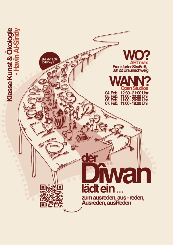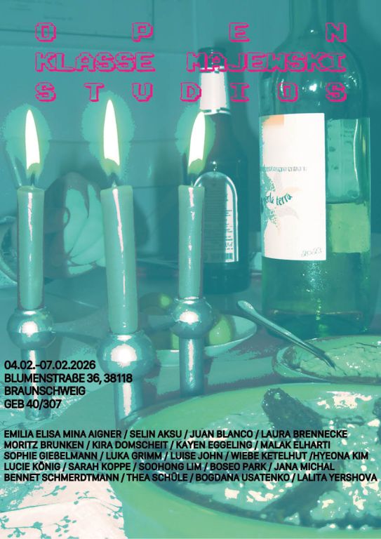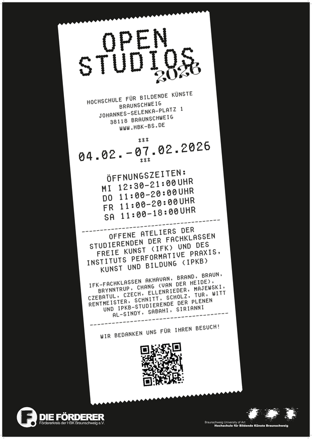 Offene Ateliers der Studierenden der Fach- und Projektklassen Freie Kunst (Akhavan, Brand, Braun, Brynntrup, Chang (Van der Heide), Czebatul, Czech, Ellenrieder, Majewski, Rentmeister, Schnitt, Scholz, Tur, Witt) und Studierenden der Plenen des Instituts Performative Praxis, Kunst und Bildung (Al-Sindy, Sabahi, Sirianni)