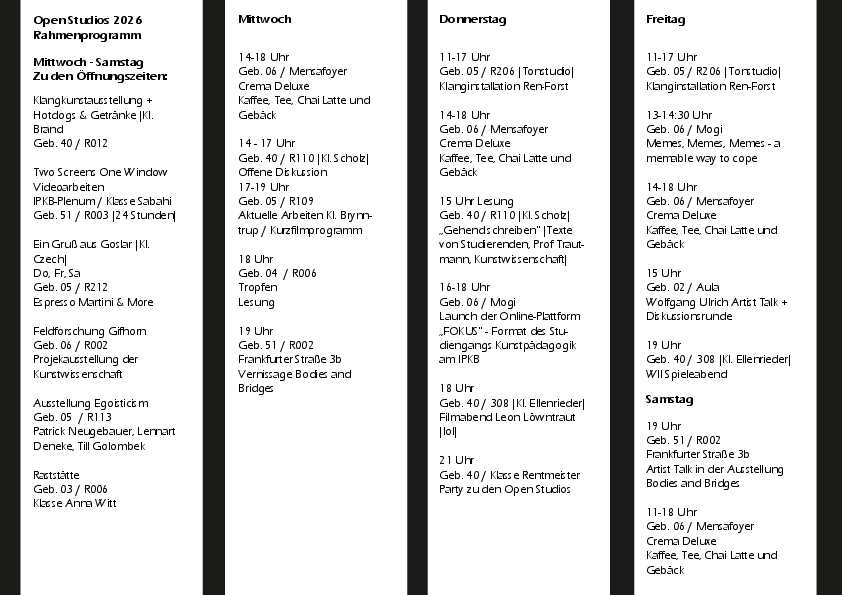 Im Rahmen der OPEN STUDIOS öffnen die Studierenden die Türen ihrer Klassenräume und Ateliers, um Besucher*innen über 4 Tage hinweg Einblicke in die laufenden Arbeitsprozesse und die unterschiedlichen Arbeitssituationen zu ermöglichen.